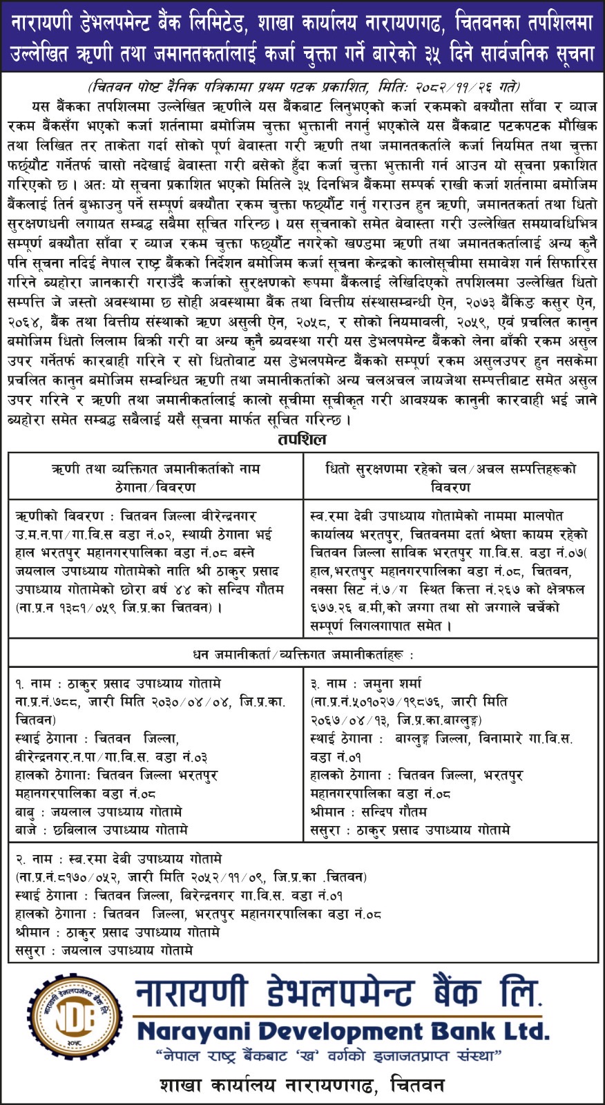 The bank’s corporate office is located at Bharatpur Municipality-10, Bypass Road, Chitwan. Currently, NDBL operates through five branches: Tandi, Yagyanpuri (Cancer Hospital), Bharatpur, Narayangarh, and Parsa. Keeping customer needs in focus, the bank plans to expand its services to additional locations in compliance with the regulations of Nepal Rastra Bank.